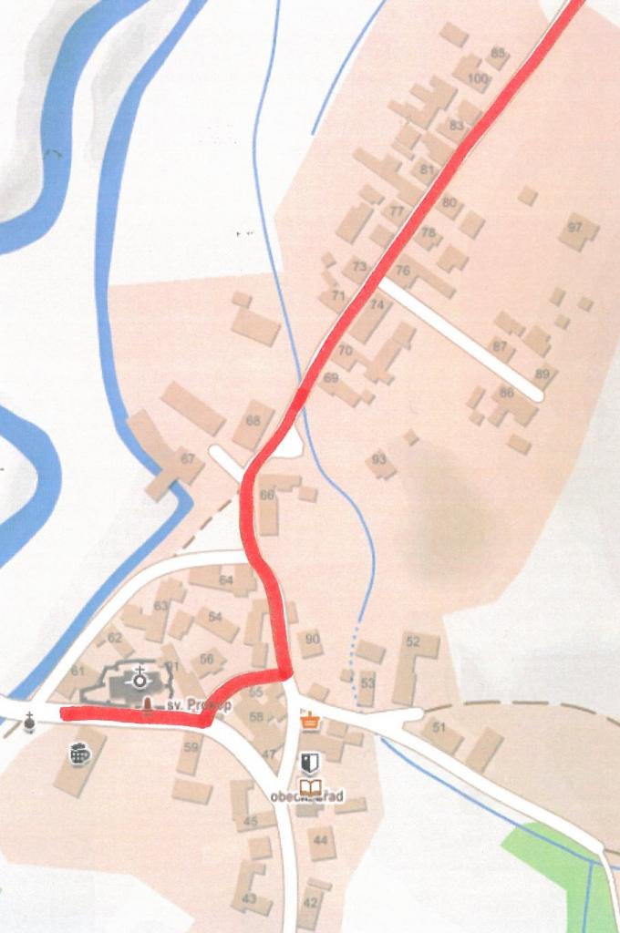 a dále pak na místní komunikaci u č.p. 66, 90, v uličce u č.p. 55, 56 a u kostela sv. Prokopa,